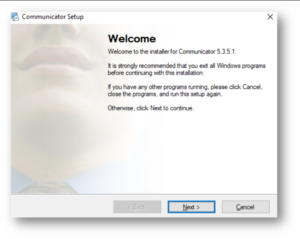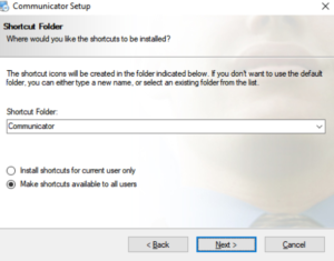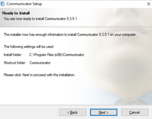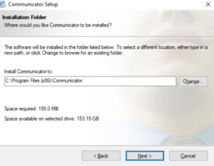 The Installation Folder window sets the default location where the Communicator installation will reside. To select a different location, click on the Change button.