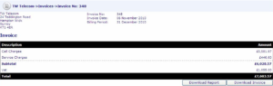 The invoice is then broken down into further detail, as shown in the below image. The call charges and the service charges are shown separately. Both of these, as well as their respective amounts, are clickable fields. From here you can also download the invoice or reports.