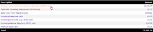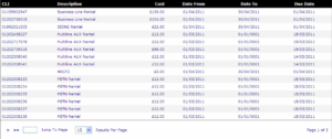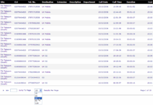 Selecting any of these will provide you with an itemised breakdown of the chosen call type (next image). Depending on volume this may run across several pages, which can be navigated by using the arrows at the foot of each page. The number of data displayed can also be increased (or decreased), using the ‘results per page’ option.